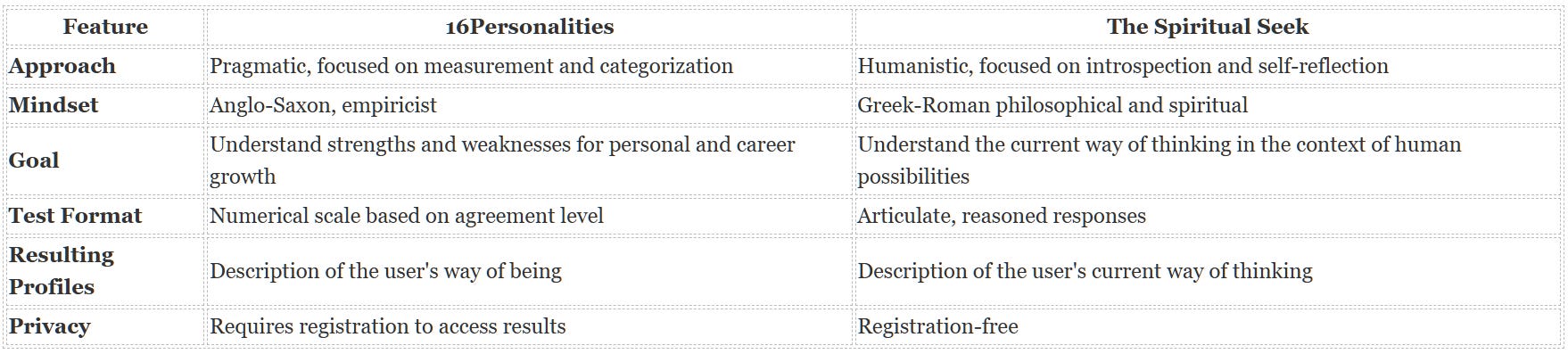 In conclusion, both 16Personalities and The Spiritual Seek offer valuable tools for self-discovery. While 16Personalities provides a pragmatic and descriptive analysis of character from a social and work perspective, The Spiritual Seek focuses on introspection and individual thinking. Both platforms provide complementary approaches to understanding the self, and they can be used in parallel to gain a comprehensive picture of one’s character. The Spiritual Seek recommends that if you take the 16Personalities test first, you will be able to appreciate the unique aspects of the tests provided by The Spiritual Seek more fully, or vice-versa.